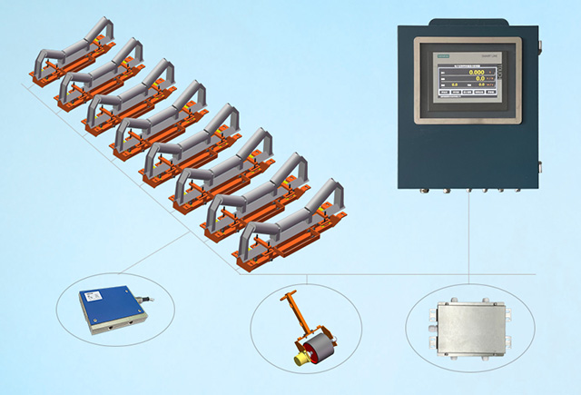 16只SPH高精度动载型抗侧力传感器,外廓平行四边形,内部三重梁结构,每只传感器均为1个单独的信号进入采集单元单独数据计算,可有效抵消侧向力及两个传感器之间的内部扭力,确保动态计量效果前提下最大限度抵消皮带跑偏及物料偏载影响。